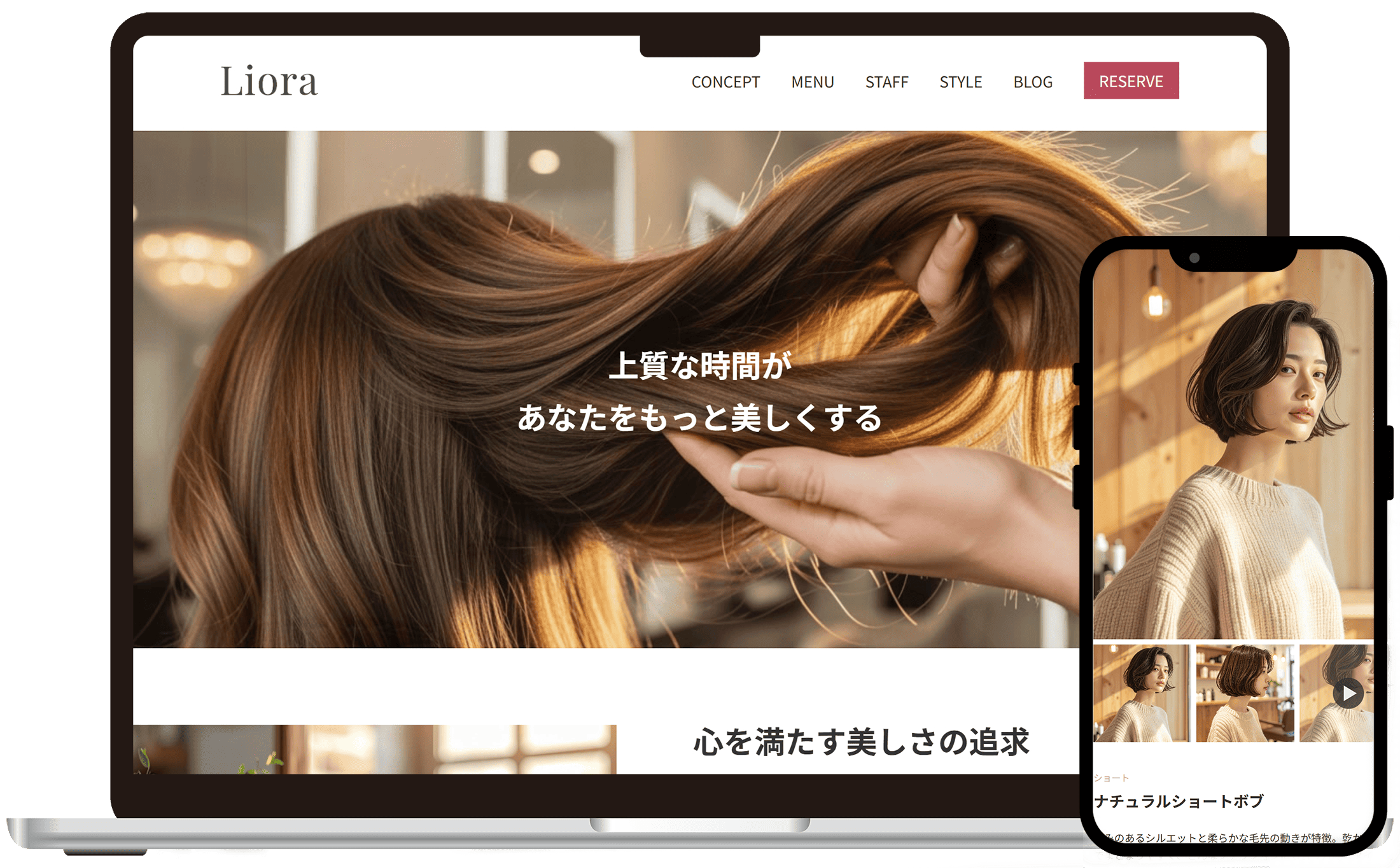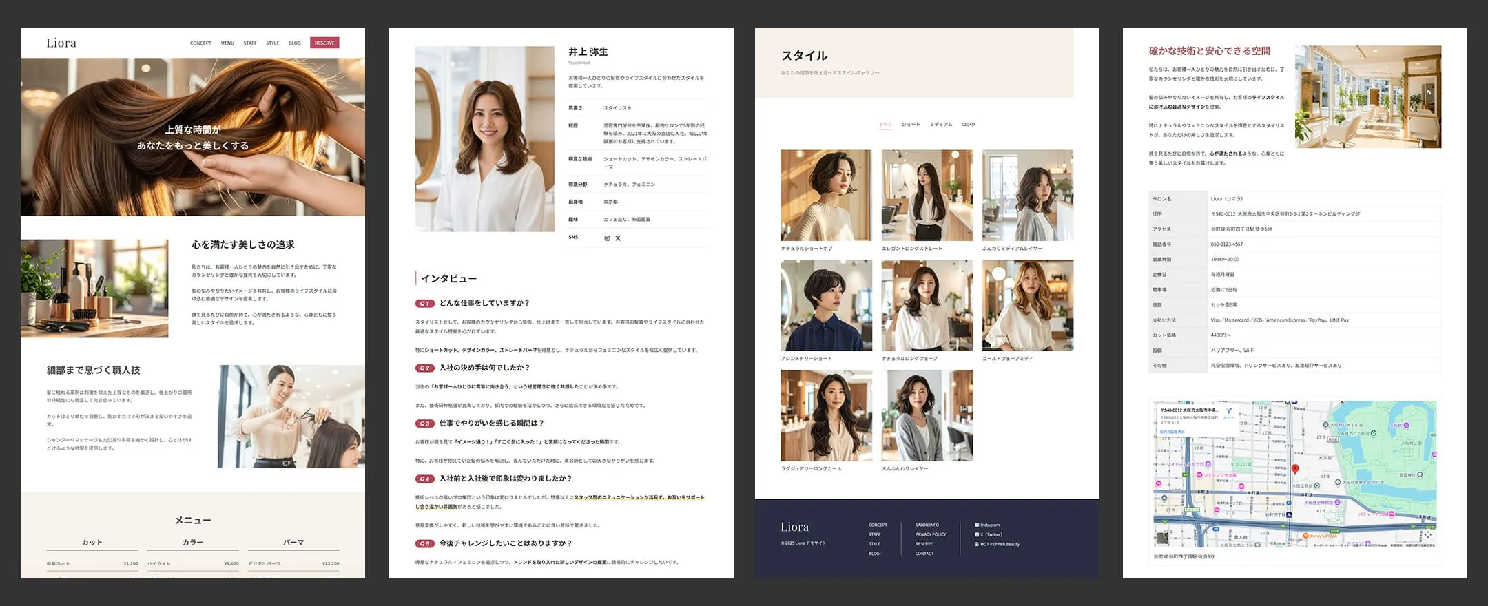 ヘアカタログやスタッフ紹介、予約フォームなど、サロンに必要な機能を網羅。