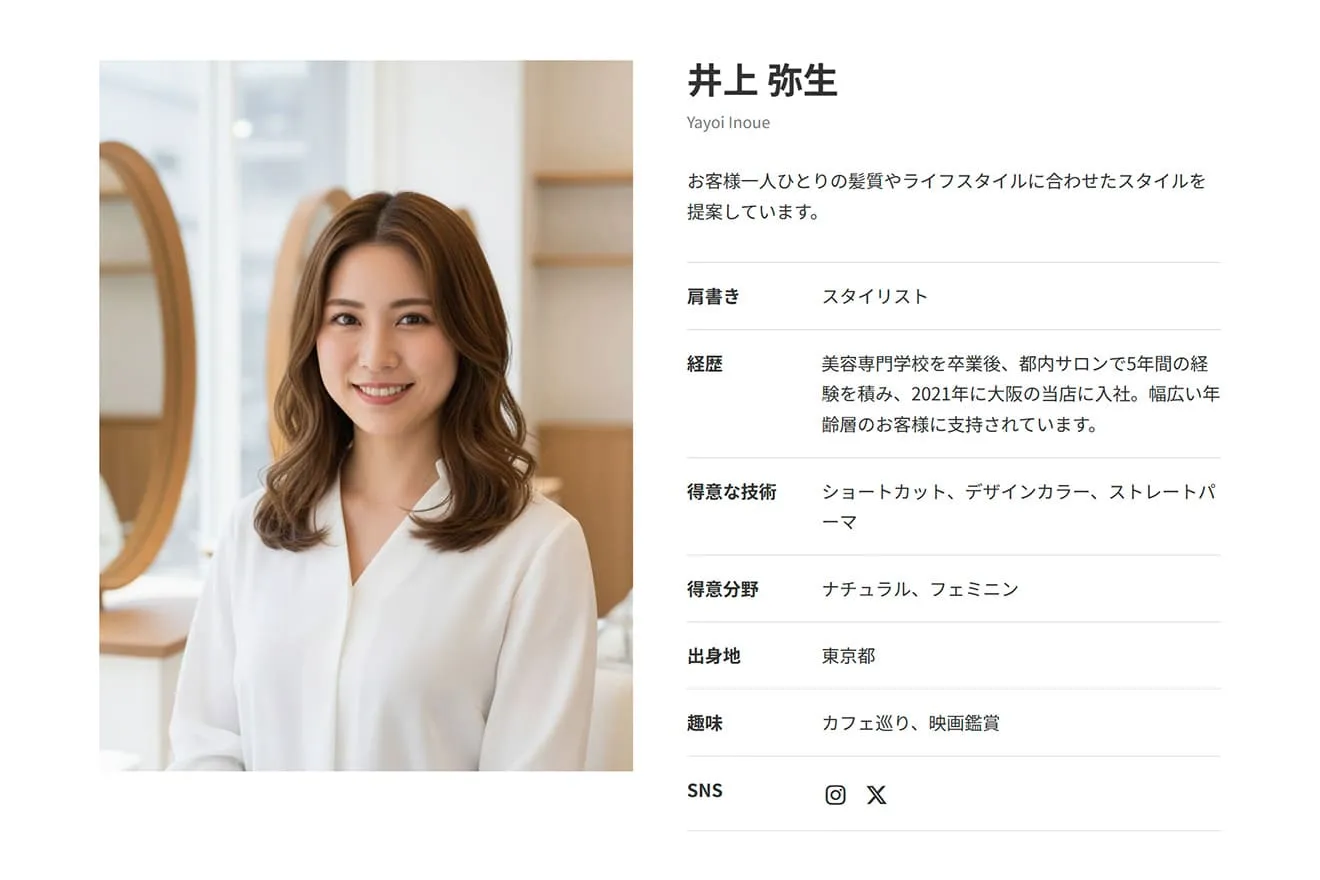 写真や経歴、得意技術などを直感的に表示でき、スタッフ一人ひとりの個性と技術力をアピール。