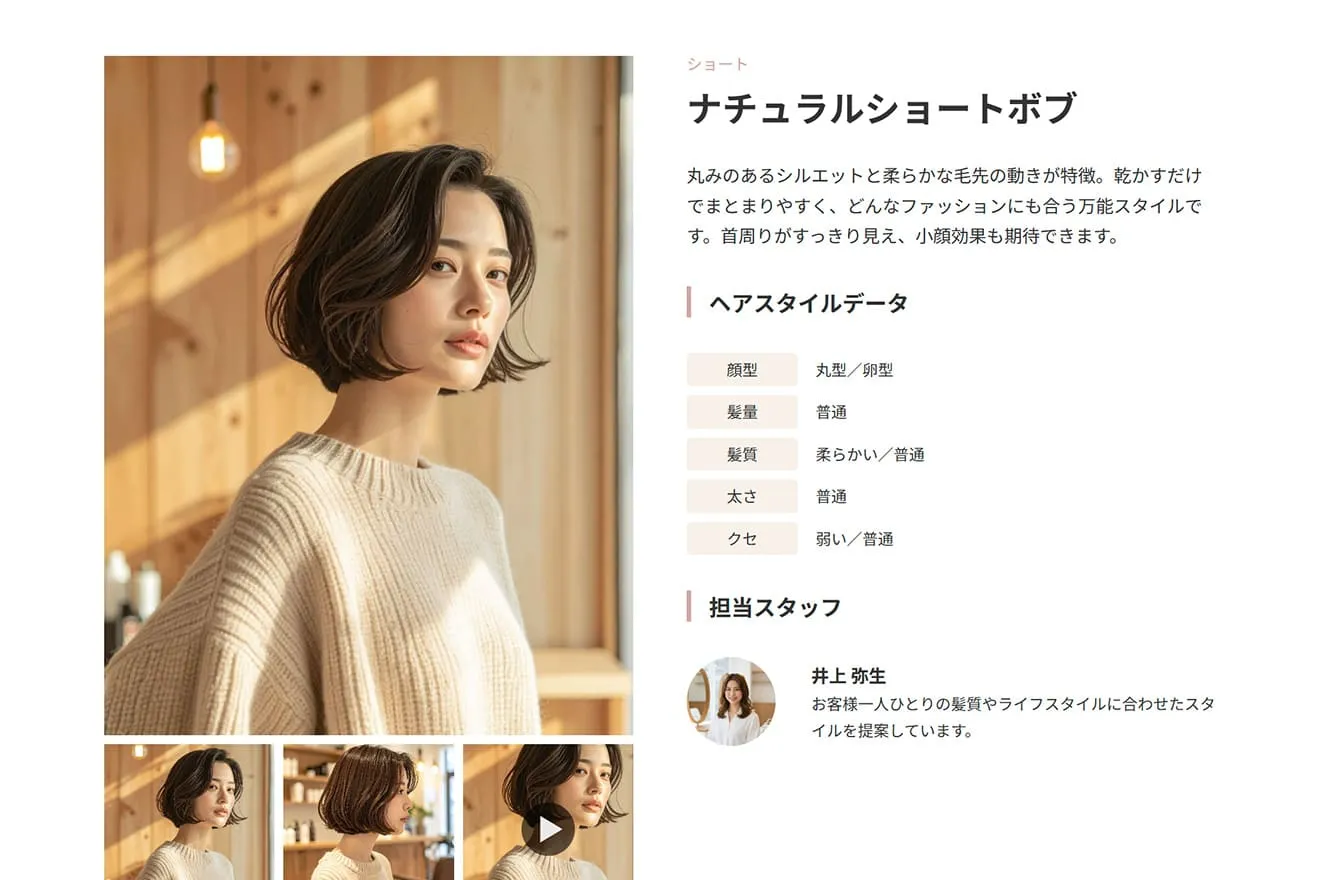 顔型や髪質などのスタイルデータを公開し、完成イメージを魅力的に提示します。