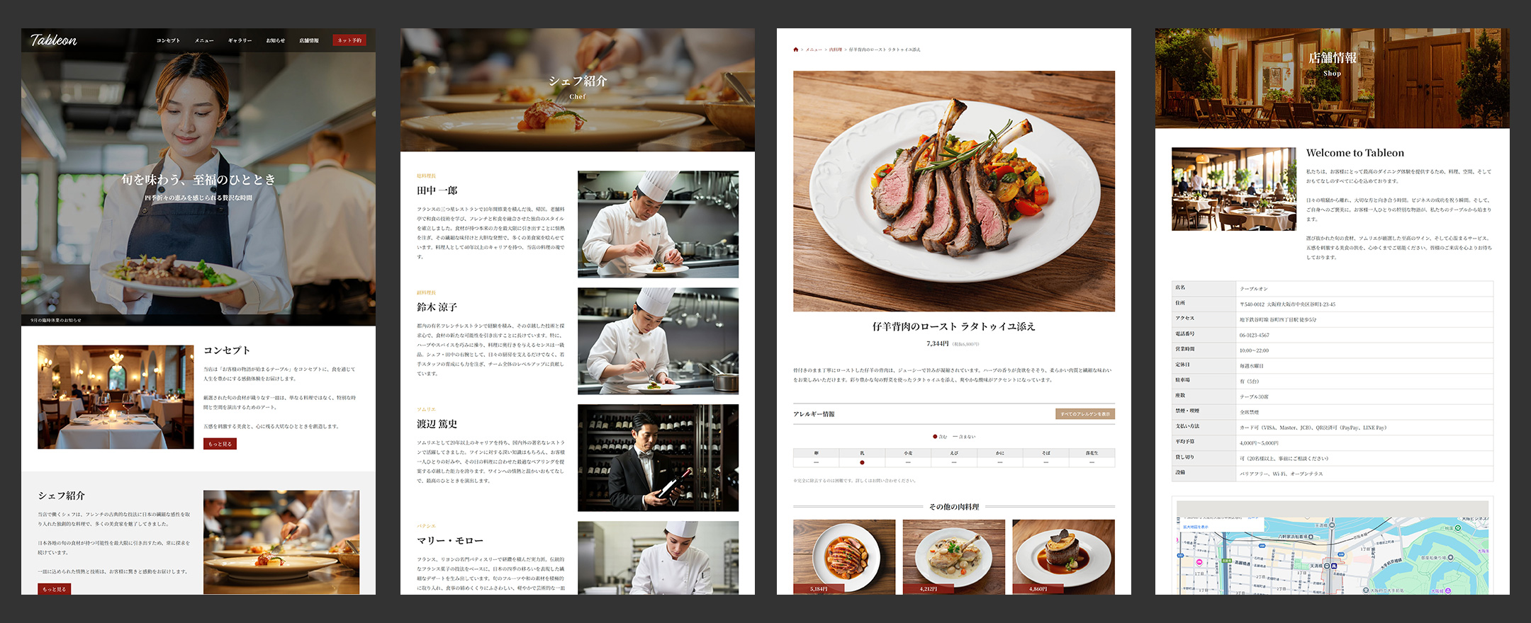 料理の魅力を引き立てるメニュー表示や直感的に使える予約フォーム、雰囲気を伝えるギャラリーなど、飲食店に必要な要素を美しく整理しました。