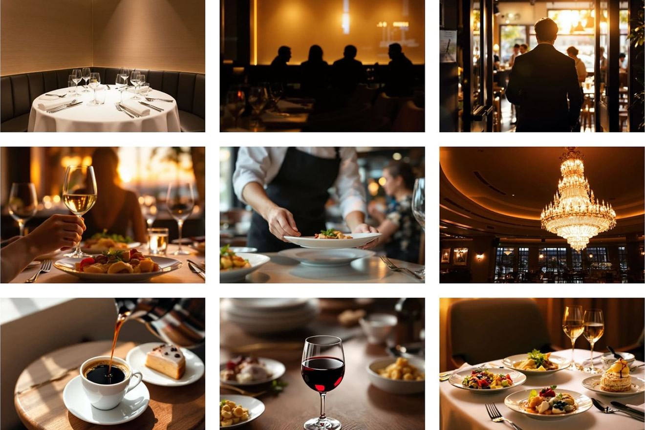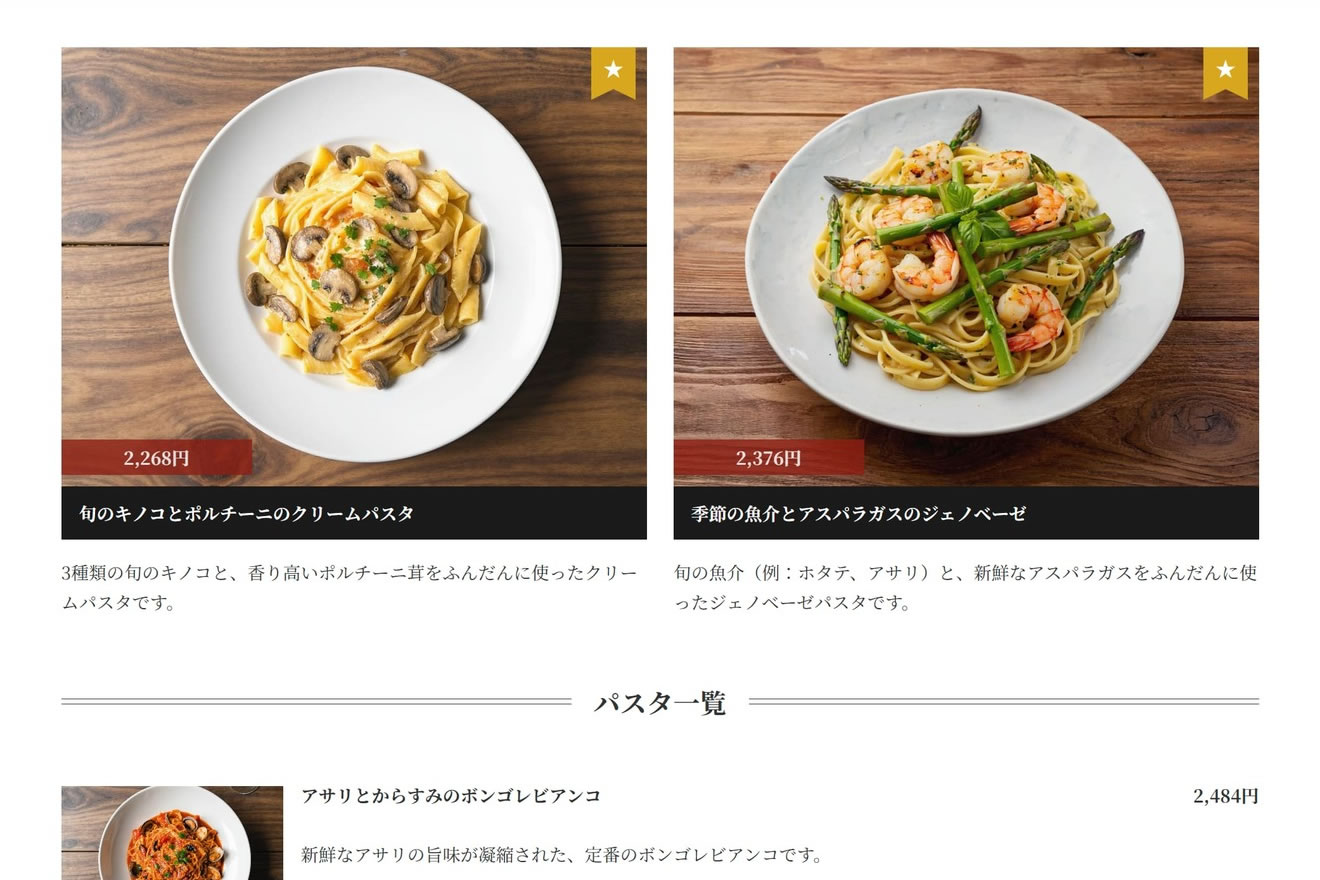 カテゴリーごとのメニュー表示で料理を美しく紹介。おすすめやアレルギー情報も掲載でき、安全と信頼を同時に伝えます。