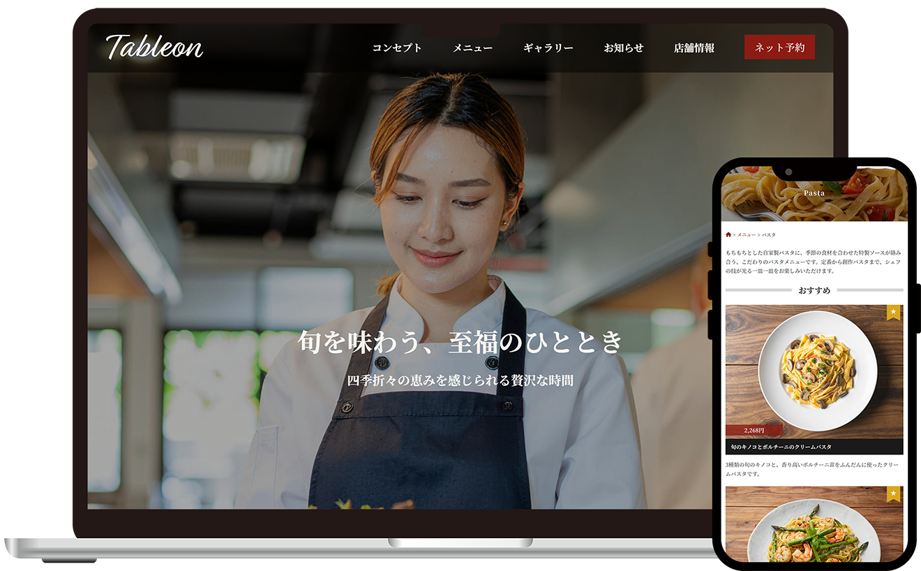 料理の魅力を引き立てるメニュー表示や直感的に使える予約フォーム、雰囲気を伝えるギャラリーなど、飲食店に必要な要素を美しく整理しました。
